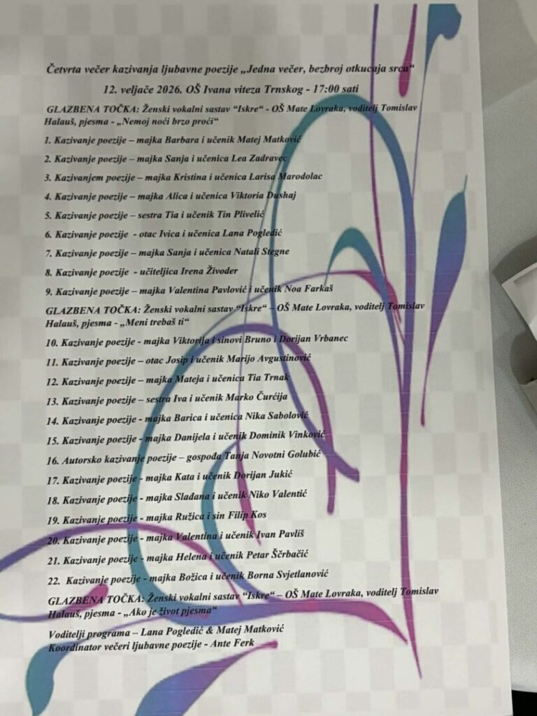 U Osnovnoj školi Ivana viteza Trnskog u Novoj Rači, 12. veljače, održana je Četvrta večer kazivanja ljubavne poezije povodom Valentinova – Dana zaljubljenih, pod nazivom “Jedna večer, bezbroj otkucaja srca”. Školski hol postao je mjesto susreta riječi, emocija i zajedništva, ispunjen stihovima koji su govorili tiho, ali snažno – jezikom ljubavi. Posebnost ove večeri bila je zajednička interpretacija poezije učenika i članova njihovih obitelji. U holu škole su se izmjenjivali glasovi djece, roditelja, braće i sestara, stvarajući dirljiv dijalog među generacijama.