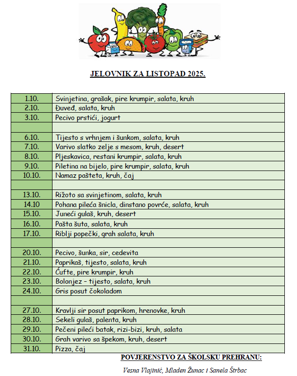 JELOVNIK Školska godina 2025./2026. JELOVNIK ZA LISTOPAD Školsko PovjerenstvO VESNA VLAJINIĆ Mladen Žunac PETRA POREDSKI ŠKOLSKE KUHARICE: JASNA OŽBOLT KSENIJA DEMŠIĆ